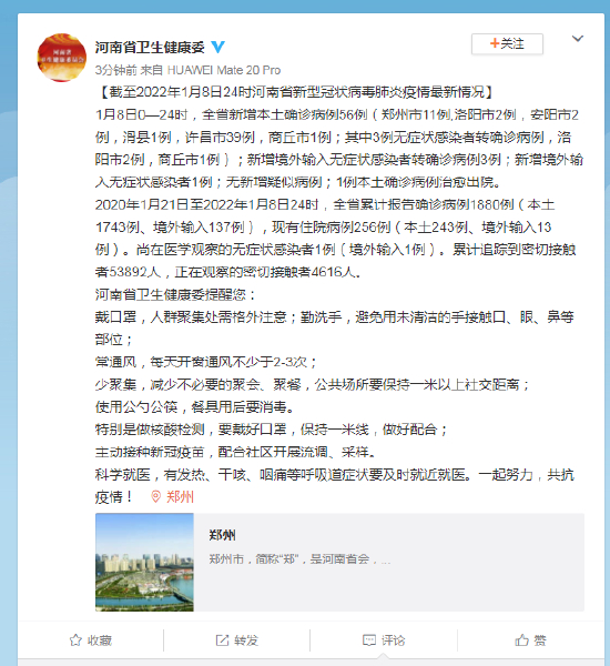 河南1月8日新增本土确诊56例 其中郑州11例许昌39例