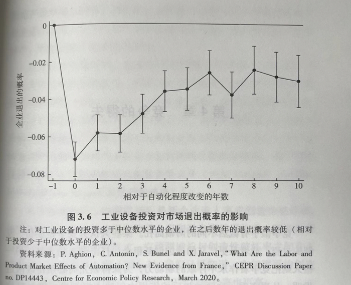 前文提到过更为悲观的发现,即自动化对通勤区的就业产生了负面效应。我们该如何调和上述乐观结论与悲观发现?一种思路是,之前已经提到,对通勤区的自动化或机器人利用水平做测算存在困难。第二种可能的思路是,推进自动化不力的企业会减少员工规模,把生产外包,或者关门破产。这反映了自动化对就业的挤出效应。如图3.6所示,对新工业设备大量投资的企业与投资不足的企业相比,在今后10年歇业的概率会大大下降。