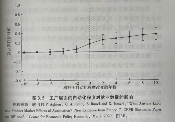 我们的测算结果显示,自动化对就业其实有正面促进作用,而且随时间加强。一家工厂的自动化程度在当前提升1个百分点,会使2年后的就业提高0.25%,使10年后的就业提高0.4%(图3.5)。特别需要指出,这个效应对非技能制造业工人依然为正。或者说,与人们的预想相反,自动化给工厂创造的就业岗位多于摧毁的就业岗位。