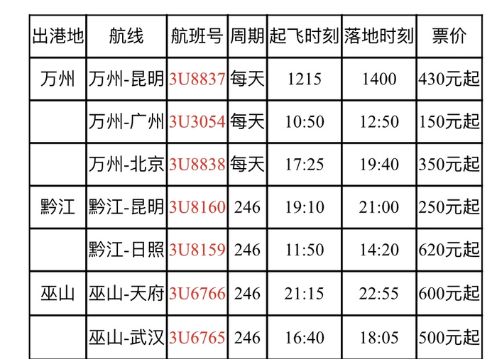 截至目前,川航已开通万州、黔江、巫山等机场的多条航线,具体航班时刻如下: