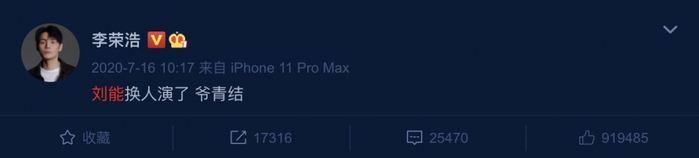所以,当上一季“刘能”的演员人选被换成赵明远后,无数观众直呼太遗憾了。2020年7月,《乡村爱情13》播出后,著名歌手、《乡村爱情》忠实观众李荣浩也发微博直呼“刘能换人演了 爷青结”,这当即就冲上了热搜,点赞数突破了90万。与此同时,上游新闻记者也看了第13季的部分剧情,确实让人感觉是赵明远极力想表现出王小利版刘能的味道,但始终不如王小利本人的演绎。