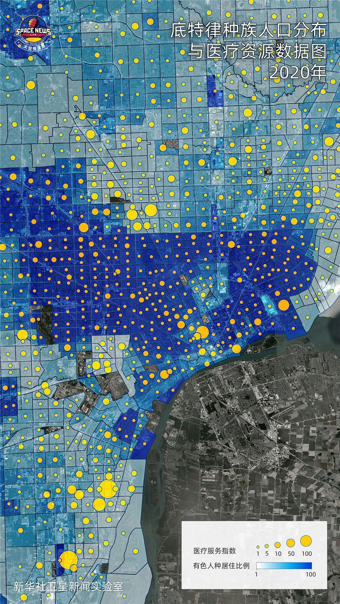在这张根据Open Street Map开源数据制作的数据地图中,黄色圆点越大,代表区域内人均可获得的医疗资源越多。实际上,仅看分布密度,有色人种社区就与白人社区存在明显差异。