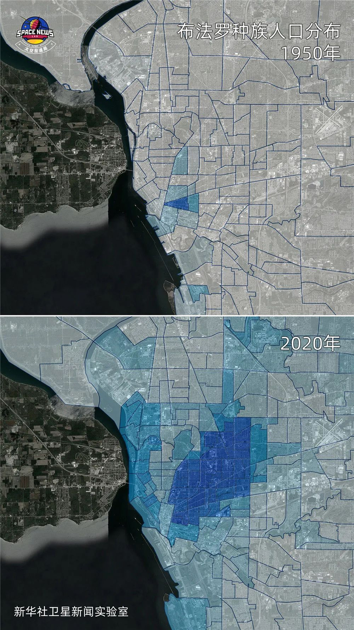 通过商业卫星影像、公开的人口普查统计、POI(地图信息点)等一系列数据,美国城市顽疾显现:无论如何扩张和变化,种族歧视带来的分裂始终存在,绝大多数黑人和其他有色人种只能一直生活在“自己的社区”。