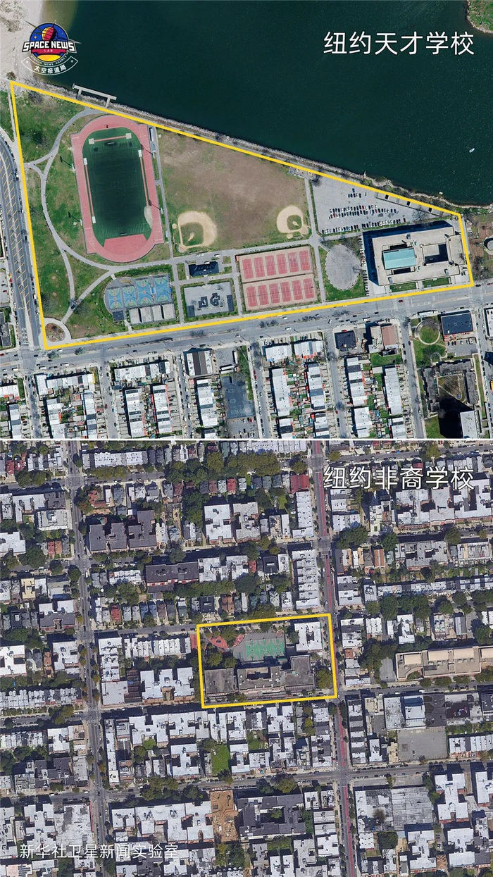 在纽约,以“天才”为名、白人学生过半的学校,拥有12座网球场、一座棒球场、若干篮球场和一座大型运动场;而在非裔学生占比91.1%的另一所学校,卫星只发现了3个篮球场。
