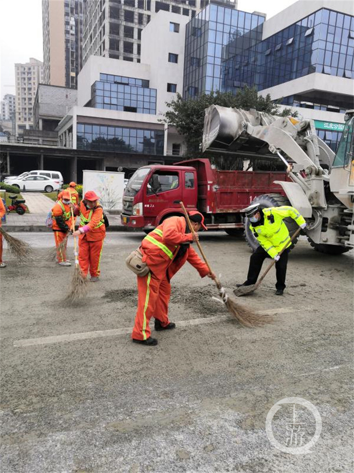 早上6时许,市政部门出动铲车、渣车以及二十来名清洁工人,和民警一起,忙活了四个多小时,终于将整个路面清理干净。