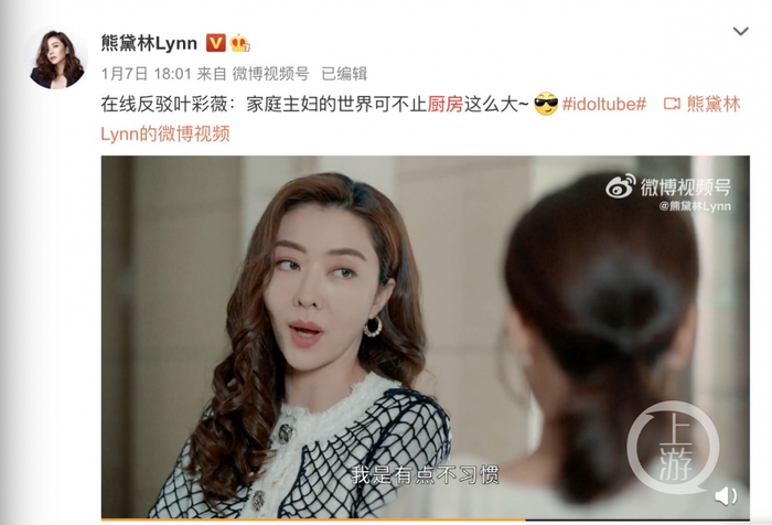 《家族荣耀》开播后,熊黛林结合自己饰演的叶彩薇的经历曾发微博感慨“家庭主妇的世界可不止厨房这么大”。采访中,熊黛林也进一步解释了自己说的这句话的意思。