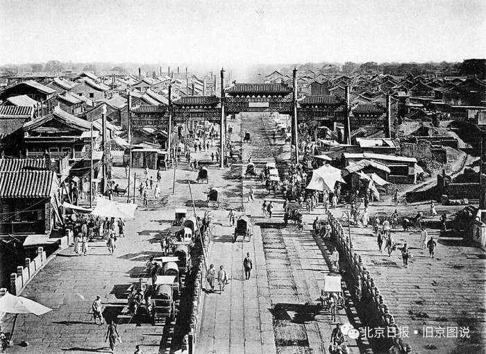 1874年的北京前门大街,可见远处的五牌楼和近处的“乞丐桥”。从明朝开始,老北京就形成了很多固定的市场,其中在正阳桥的叫穷汉市,在这里做买卖的都是小老百姓,他们没钱租房子,就在正阳门前沿着城墙搭棚子摆摊糊口。而正阳桥中间,因为不允许车辆通行,所以就成了街溜子耍钱、叫花子要饭的聚集地,也就成了当时洋人眼中的乞丐桥。