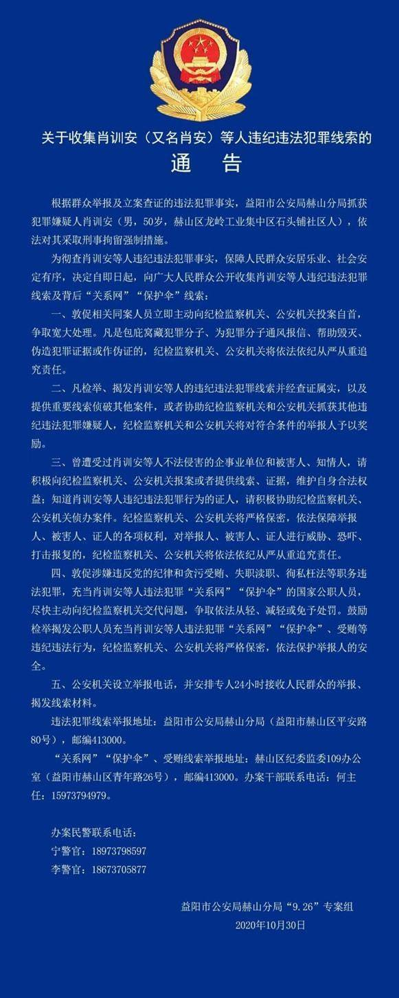 相关信息显示,本案由当地市、区两级扫黑办指导办理,益阳市公安局赫山分局为此成立了“9.26”专案组,先后两次在网上发通告,悬赏征集“肖训安等人恶势力犯罪团伙”的违纪、违法犯罪线索。2021年8月,其与曾举报、诈骗“益阳首富”倪福林的殷小聪等人一起,被赫山区检察院列为“恶势力”。