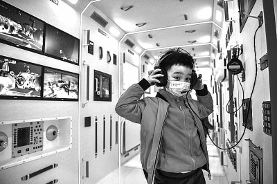 2021年12月12日,小朋友在成都武侯区潮音社区的社区太空探索中心中国空间站核心舱模型内体验。新华社发
