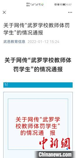 中新网衡水1月12日电 (记者 崔志平)就网传“武罗学校教师体罚学生”一事,河北省武邑县官方12日通报称,涉事教师已被解聘,对武罗学校予以全县通报批评。