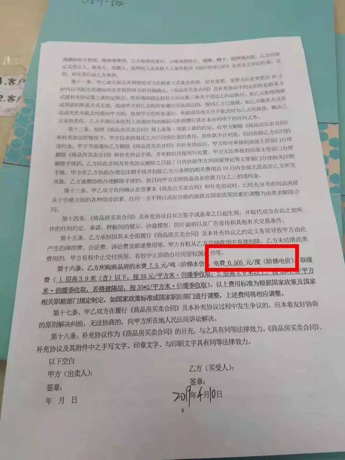 根据刘女士提供《商品房买卖合同》补充协议第十六条规定,乙方所购商品房的水费为7.5元每吨(阶梯水价)、电费0.505元/度(阶梯电价)。“商业用电本身就不存在阶梯计价一说!只有民用电才是阶梯电价!这是在玩文字游戏吗?”对此,刘女士向记者强调道。