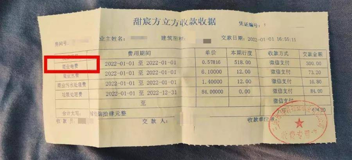 “1月3号,我们有业主在缴费的时候,发现收费单上的民电被改成了商电。我们是业主,享有知情权,他们却支支吾吾的不说,不仅如此,电价还涨了,单价由每度0.505元变成了每度0.578元。”