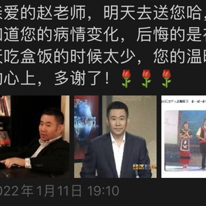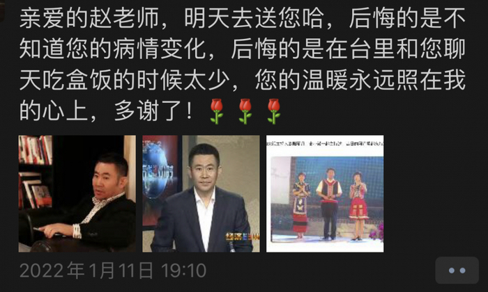 “后悔的是不知道您的病情变化,后悔的是在台里和您聊天吃盒饭的时候太少,您的温暖永远照在我的心上,多谢了!”两天前,从重庆电视台走进央视的著名节目主持人史小诺在微信朋友圈写下了这样一段话。她要送别的是自己在央视财经频道的同事、主持人赵赫。