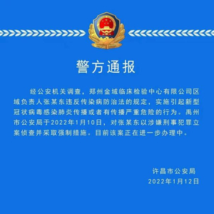 1月12日凌晨,河南省许昌市公安局通报称,经公安机关调查,郑州金域临床检验中心有限公司区域负责人张某东违反传染病防治法的规定,实施引起新型冠状病毒感染肺炎传播或者有传播严重危险的行为;禹州市公安局于2022年1月10日,对张某东以涉嫌刑事犯罪立案侦查并采取强制措施,目前该案正在进一步办理中。