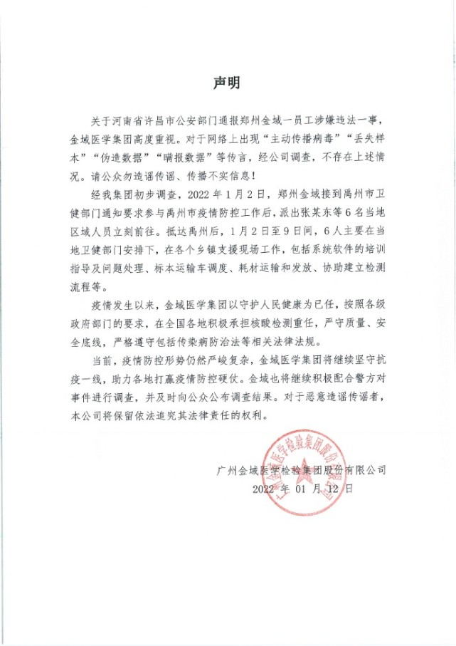 公告显示,经公司初步核实,2022年1月2日,郑州金域接到许昌市下属禹州市卫健部门通知要求参与禹州市疫情防控工作后,派出4名工作人员立刻前往,与张某东等2名当地区域工作人员组成6人支援小队。抵达禹州后,1月2日至9日间,6人主要在当地卫健部门安排下,在各个乡镇参与现场辅助工作。关于郑州金域员工张某东涉嫌违法事件,金域医学正在积极配合警方对事件进行调查,调查结果明确后将及时向公众公布。