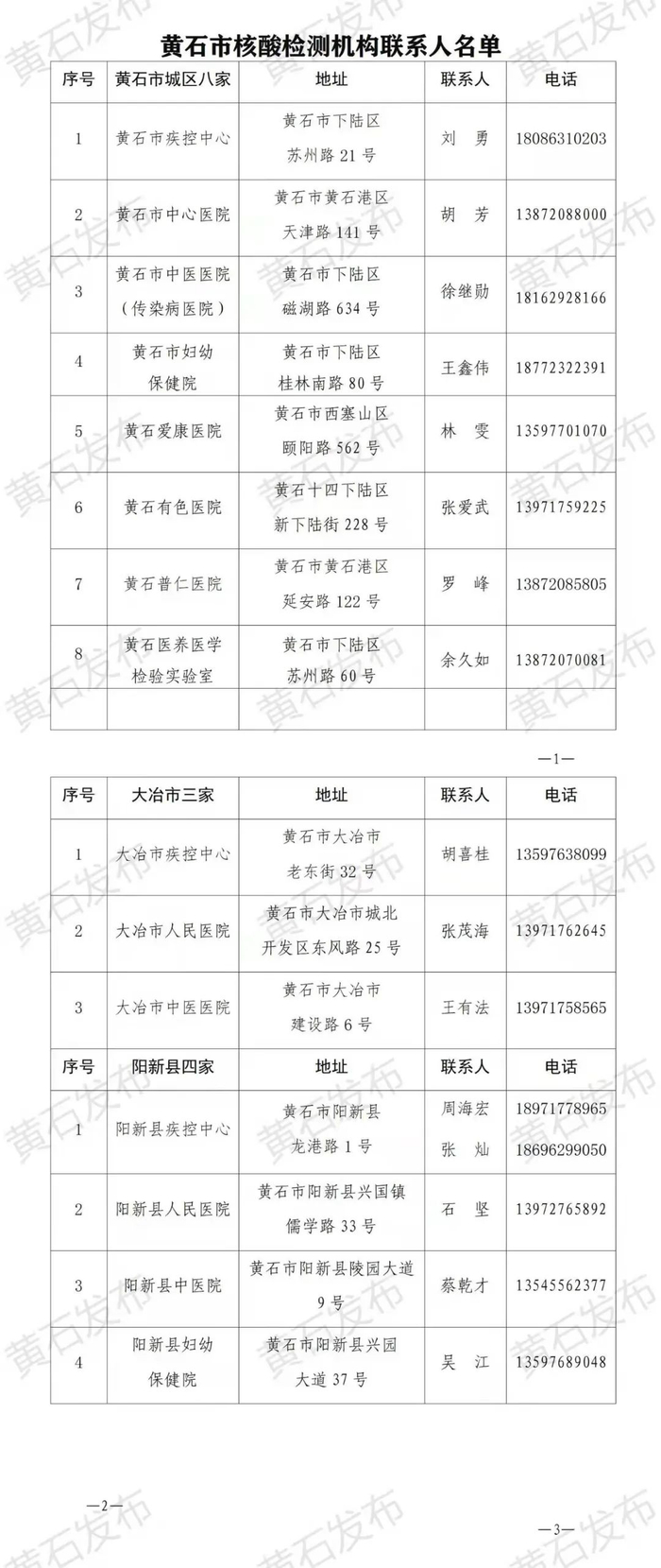 其中城区8家,分别是黄石市疾控中心、黄石市中心医院、黄石市中医医院(传染病医院)、黄石市妇幼保健院、黄石爱康医院、黄石有色医院、黄石普仁医院和黄石医养医学检验实验室;
