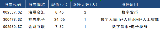3、数字货币概念继续回温,翠微股份(603123.SH)尾盘跳水,连板失败。后排海联金汇(002537.SZ)录得2连板。