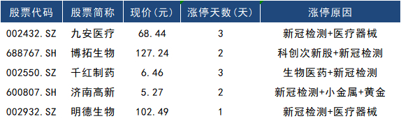 2、新冠检测持续走强后今日出现分化,焦点股安旭生物(688075.SH)跌6.56%,九安医疗(002432.SZ)3连板再创历史新高。