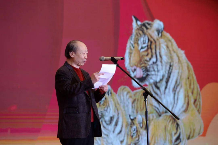 2022年1月5日,冯大中在《壬寅年》特种邮票首发仪式现场分享创作生肖邮票的心路历程。