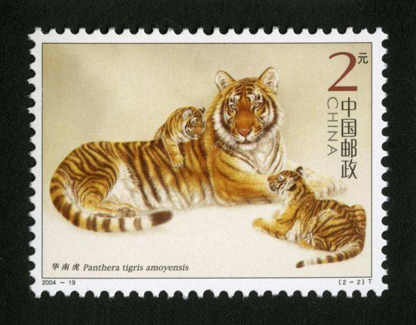 2004年发行一套2枚《华南虎》特种邮票,也是工笔画法,没有刻意展现传统印象中老虎的“威风凛凛”,老虎表情是否也“沉静而忧郁”呢?