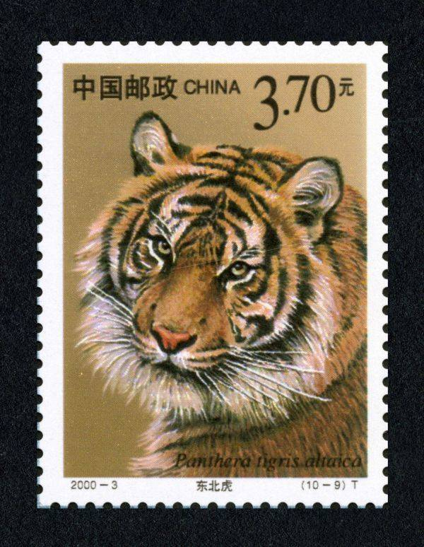 2000年2月,中国邮政发行了一套《国家重点保护野生动物(Ⅰ级)(一)》特种邮票,第9枚为东北虎,以特写镜头展现东北虎圆瞪双眼的威严。