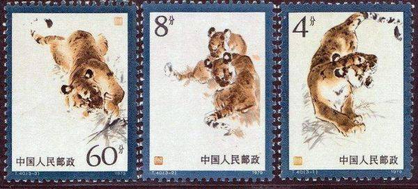 1979年,中国邮政发行《东北虎》特种邮票,全套3枚,用传统水墨画技法,分别描绘了东北虎引颈长啸、相依相偎、捕猎食物的形象。