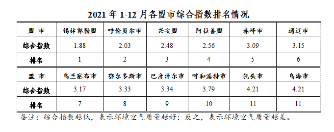原标题:内蒙古自治区生态环境厅公布2021年1-12月全区环境空气质量状况