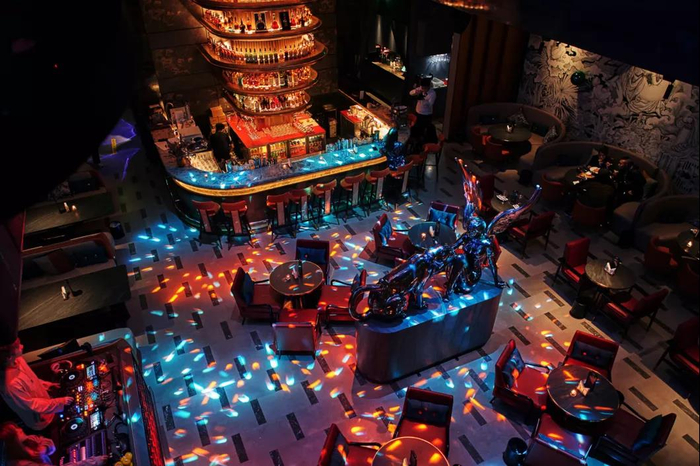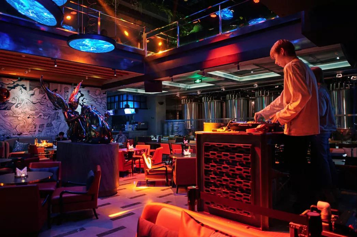 每日21点以后,驻场DJ现场打碟演绎,餐厅进入一种魔幻式的场景转变—酒吧模式。全场灯光昏暗,雾气缭绕,棚顶的机械灯光随着音乐的节奏高低起伏,这样的场景让人不自觉的跟着节奏扭动身体,小酌几口杯中酒,带着一点微醺的酒意,放下全身的疲惫与束缚。