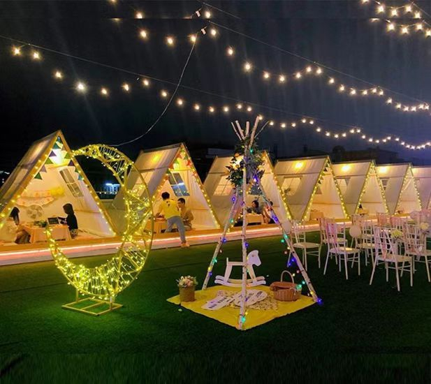 从一个人的宁静到一群人的狂欢,往往只需要一点契机,而“星巢”露营地就是这么一个契机。星巢露营区占地10000平方米。主打休闲餐饮,共设置11顶三角形帐篷。帐篷旁边摆放着烧烤架、夹子、叉子等,可供游客烧烤。