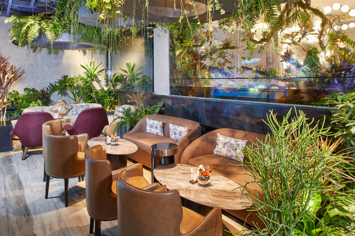 二楼大厅区别于一楼的艺术氛围,将城市中喧闹的餐厅,变成了质朴的热带园林;各种鲜活的热带植物中藏匿着餐桌与座椅,既增加了若隐若现的私密感,更多了回归原始自然的初心。