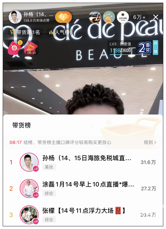 14日是孙杨在海旅免税城直播的第一天,不过他这次直播带的“货”和他的老本行关系不大,被粉丝称为阳光大男孩的孙杨,这次的直播带的货是美妆。5小时的直播中,他化身“美妆种草官”,依次在直播间销售了包括雅诗兰黛、赫莲娜、欧莱雅、娇韵诗在内的各大高端美妆产品,并涵盖水、乳、精华、眼霜、面霜、粉底液等近70个产品品类。