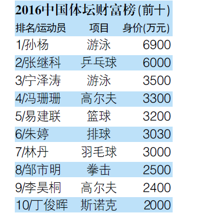 2016年,在《体坛周报》公布的代言财富榜中,年孙杨以6900万人民币高居榜首。