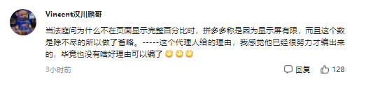 当法庭问为什么不在页面显示完整百分比时,拼多多称是因为显示屏有限,而且这个数是除不尽的所以做了省略。