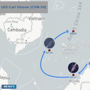[文/观察者网 王世纯]微博@南海战略态势感知1月15日消息,1月15日,根据卫星捕捉到美海军“卡尔·文森”号(CVN-70)航母打击大队的驱逐舰和巡洋舰影像判断,美国“卡尔·文森”航母打击大队已经航行至南沙群岛以北海域,自1月11日经巴拉巴克海峡进入南海后,美航母一直绕南沙群岛机动,并与同天由马六甲海峡进入南海的美海军“埃塞克斯”号两栖戒备群开展联合演习。