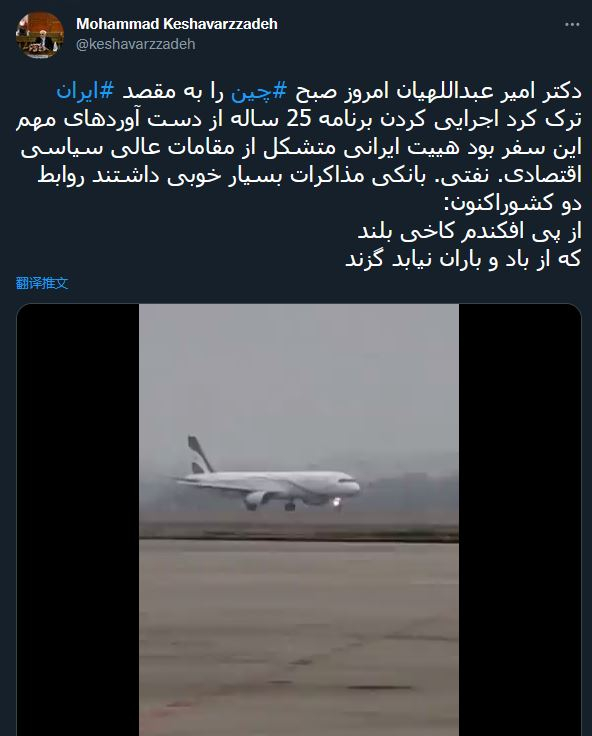 伊朗驻华大使克沙瓦尔兹扎德则在推特上表示,25年全面合作计划的实施,是此行的重要成果之一。伊朗代表团由高级政治人士和经济官员组成,两国关系现在非常好。