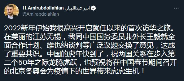 阿卜杜拉希扬14日在推特上用中文表示:“2022新年伊始我很高兴开启就任以来的首次访华之旅。在美丽的江苏无锡,我同中国国务委员兼外长王毅就全面合作计划、维也纳谈判等广泛议题交换了意见,达成了重要共识。中国的虎年快到了,祝两国关系在步入第二个50年之际龙腾虎跃,也预祝将在中国春节期间召开的北京冬奥会为疫情下的世界带来虎虎生机!”