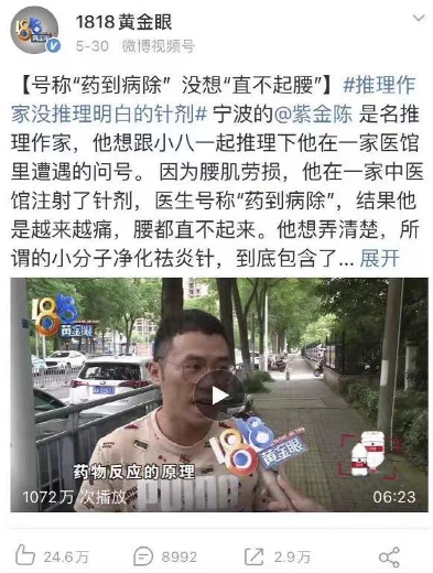 可当他花了4500元打完一针,非但没见效,连腰都直不起来了。气愤的紫金陈在微博倾诉自己的遭遇,还手动@浙江人民的温暖港湾《1818黄金眼》。