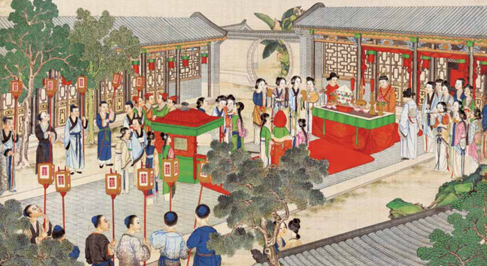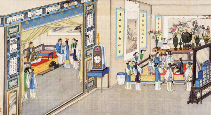 主要的人物的服装、佩饰,以及房内陈设古玩、雅件,都采用了“泥金勾染”技法,在一些花卉、地毯、甬道上,还添了厚粉,营造更立体逼真的视觉体验。
