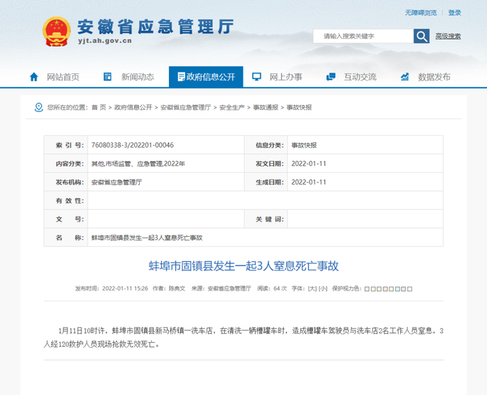 1月11日,安徽省蚌埠市固镇县新马桥镇一洗车店,在清洗一辆槽罐车时,造成槽罐车驾驶员与洗车店2名工作人员窒息,3人经抢救无效死亡。