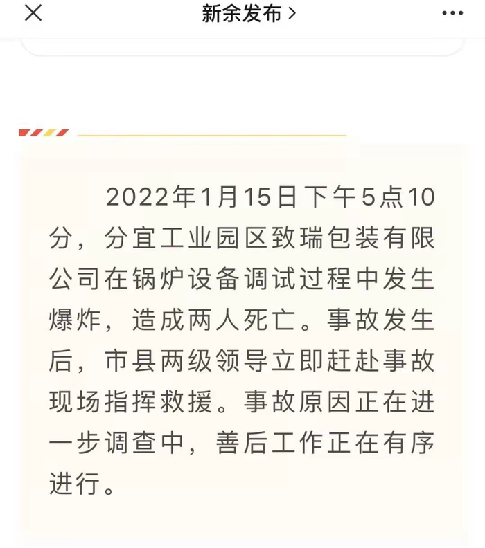 1月15日,江西省新余市分宜工业园区致瑞包装有限公司在锅炉设备调试过程中发生爆炸,造成2人死亡。