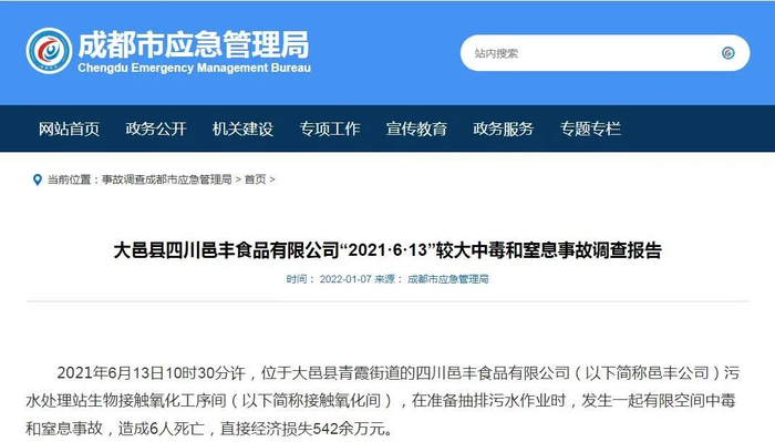 《大邑县四川邑丰食品有限公司“6·13”较大中毒和窒息事故调查报告》公布