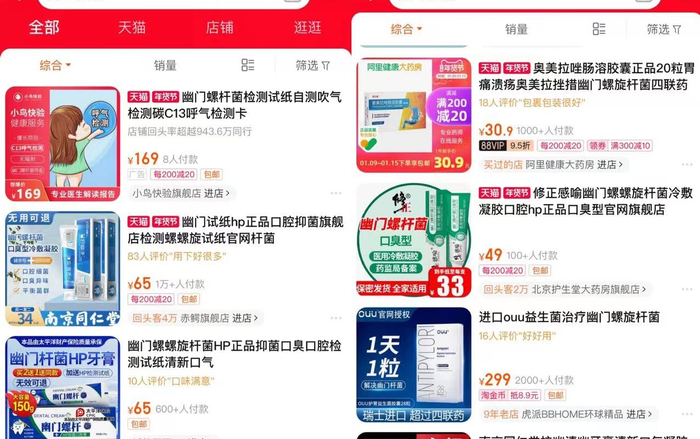 1月14日,新京报记者在某知名网购平台搜索“幽门螺杆菌牙膏”,并没有找到相关产品,关键词换成“幽门螺杆菌”搜索时,多款牙膏跃然而出。有的名字为“幽门螺杆菌检测试纸治疗HP正品口腔抑菌幽螺沙星除口臭药”“幽门螺杆HP抑菌口腔膏”,还有的名字为“幽门螺杆菌口臭型医用冷敷凝胶”。此类牙膏价格大多高于普通牙膏,价格在34元-88元。