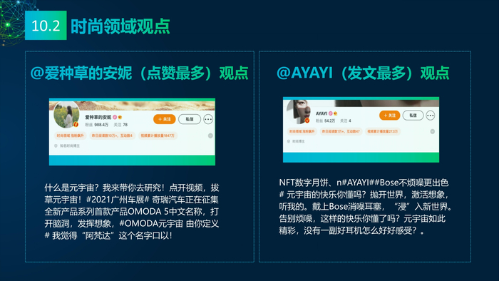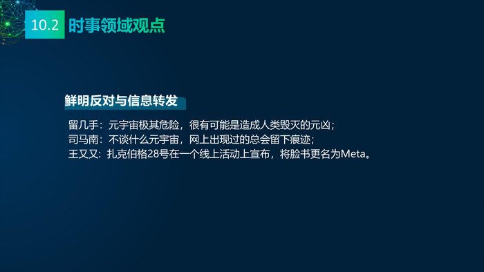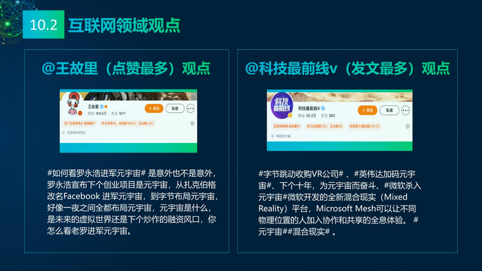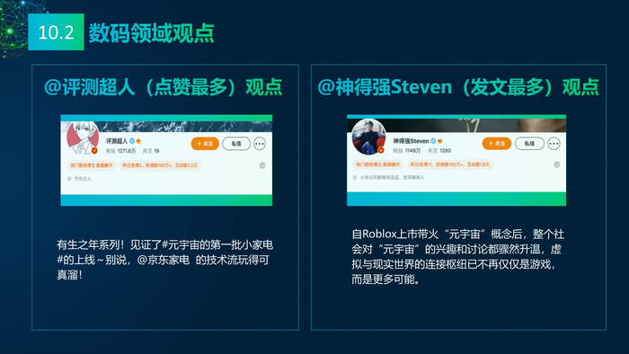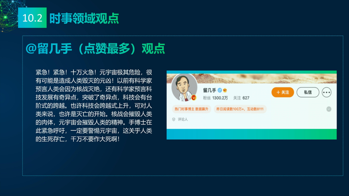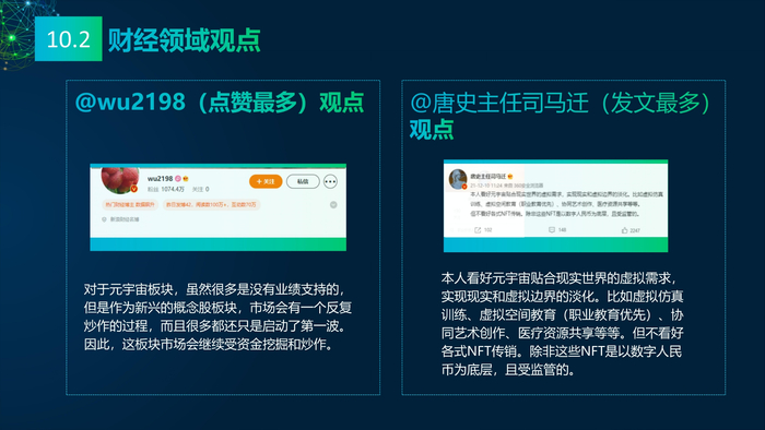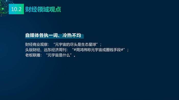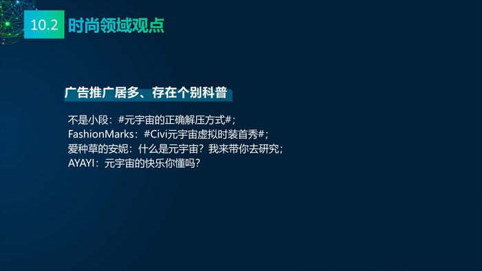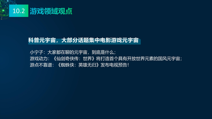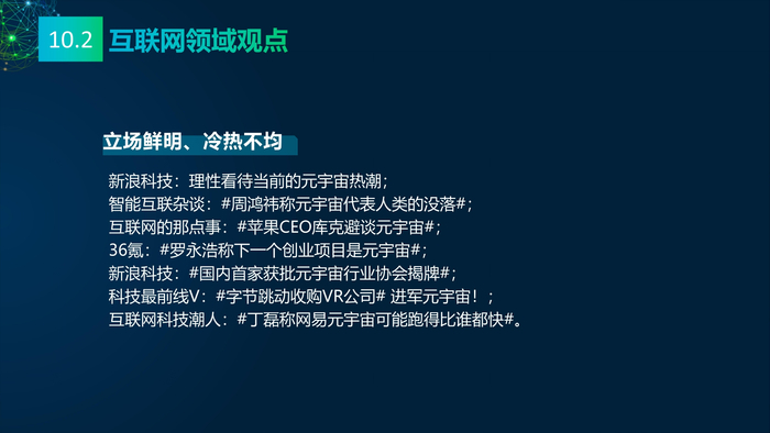 看点10:媒体的多元看点。报告研究团队收集2021年主流媒体元宇宙相关报道,将主流媒体对元宇宙的看法进行总结:元宇宙的冷与热、元宇宙的喜与忧、数字资产与数字泡沫、新科技与科技泡沫、概念股还是产业股、5G还是6G、全真互联网还是新模式。报告研究团队收集了2021年微博社交媒体关于元宇宙的数据,阐述财经、电影、游戏、数码、时事、互联网、娱乐、时尚九大领域的博文观点。