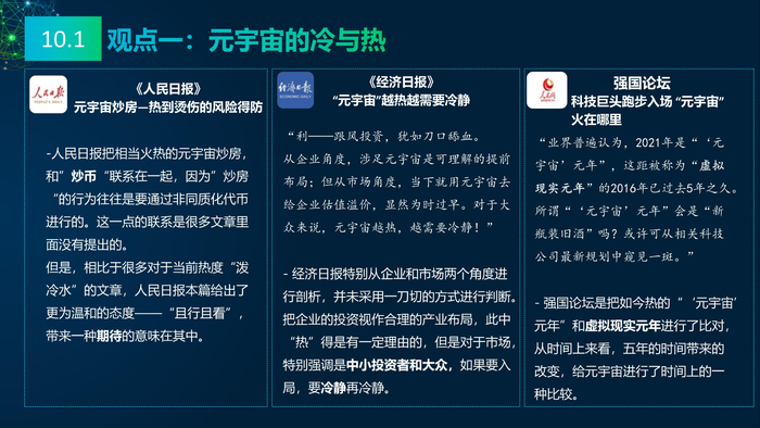 元宇宙概念和产业的发展还处于初期阶段,需要有多种社会力量参与,元宇宙生态的各个角色,对元宇宙有不同的视角和认识方法,同样也存在发展初期的各种不同观点和争论。