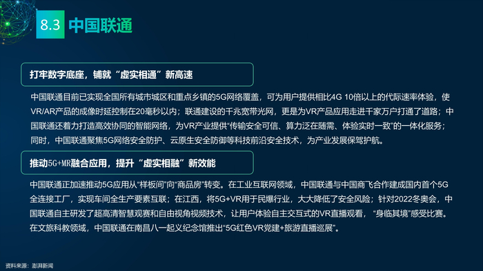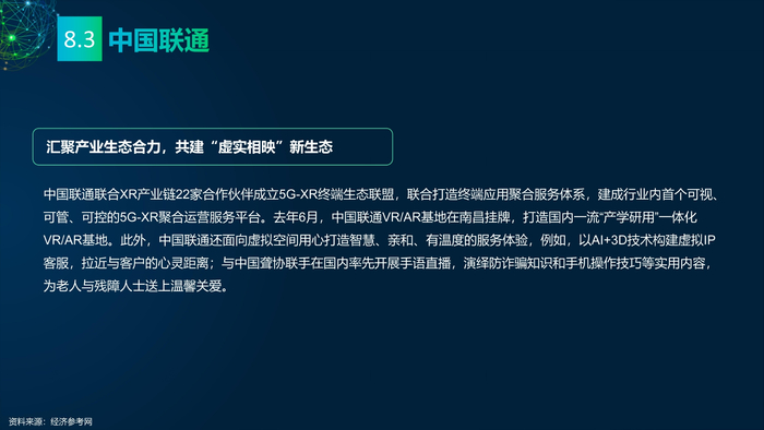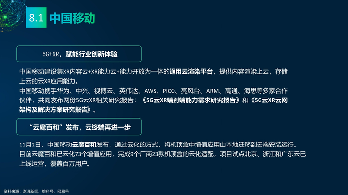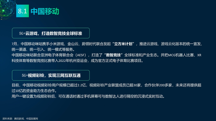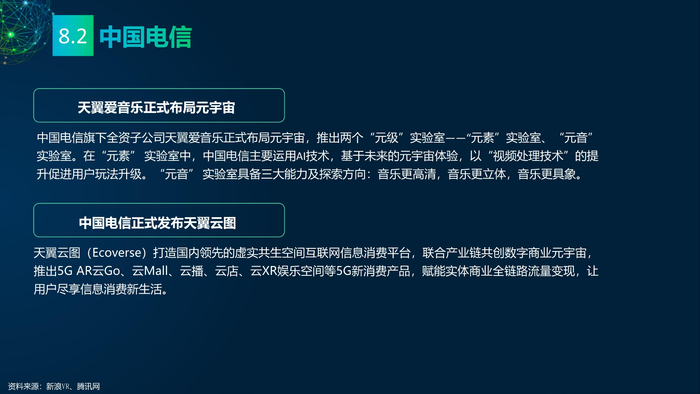 看点8:电信运营商发力元宇宙。中国移动成立全国元宇宙组织——中国移动通信联合会元宇宙产业委员会(CMCA-MCC)。中国电信旗下全资子公司天翼爱音乐布局元宇宙,推出两个“元级”实验室——“元素”实验室、“元音”实验室。中国联通在XR产业链持续发力,与22家合作伙伴成立5G-XR终端生态联盟,建成5G-XR聚合运营服务平台。