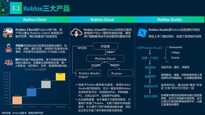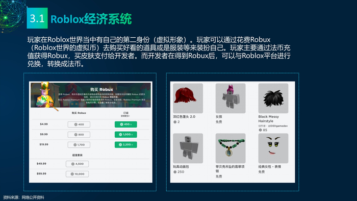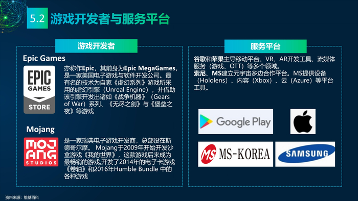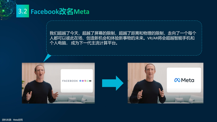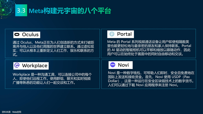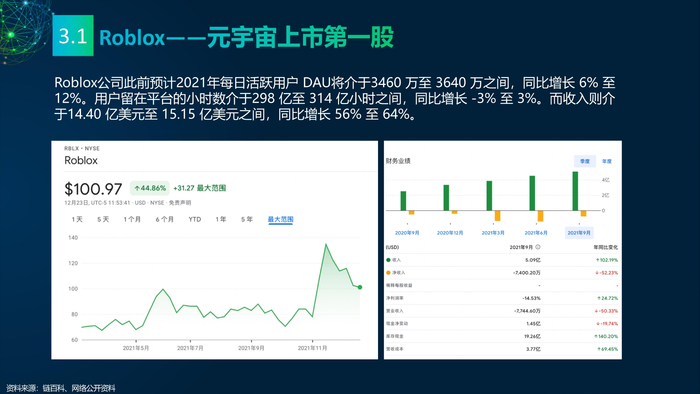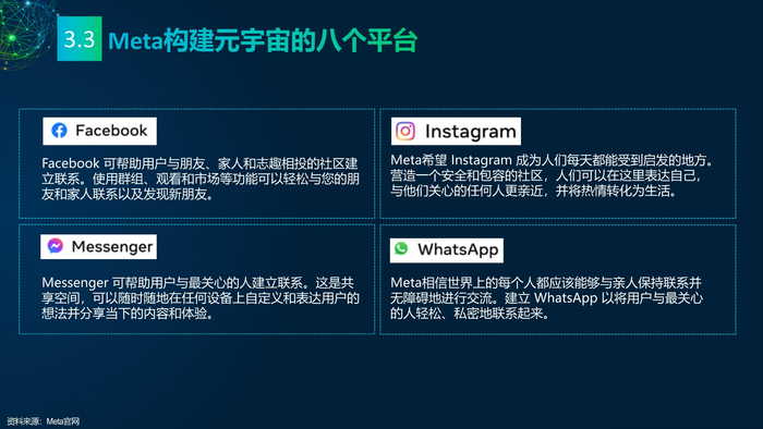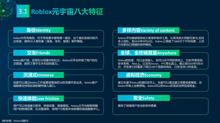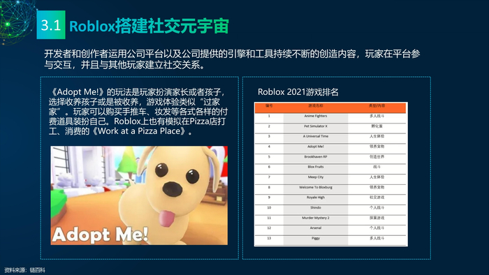 看点3: 推动元宇宙发展的重点企业。企业是元宇宙的实践者,罗布乐思(Roblox)和元(Meta)是两家致力于打造元宇宙的企业,分别实践了两条不同的元宇宙建设路线——游戏和VR。罗布乐思搭建游戏平台元宇宙,用户可以同时是玩家和开发者。脸书是全球最大的社交媒体平台,扎克伯格宣布脸书改名Meta,Meta的元宇宙包含社交、VR、虚拟办公、虚拟货币等。