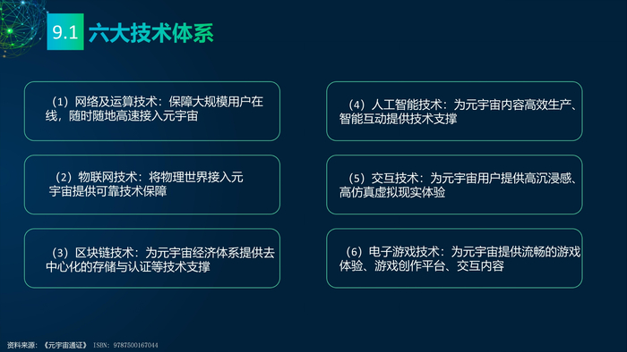 看点9:支撑元宇宙的六大基础技术。这六大技术分别是:物联网技术、网络及运算技术、人工智能技术、区块链技术、交互技术和电子游戏技术。物联网技术既承担了物理世界数字化职能,又承担了虚拟世界渗透甚至管理物理世界的职能。网络及运算技术保障大规模用户同时在线。元宇宙中的智能互动需要人工智能技术。区块链保障元宇宙价值归属于流转,实现元宇宙经济系统稳定、高效、透明的运行。元宇宙用户的高度沉浸感、高仿真互动体验需要交互技术。电子游戏技术的核心是游戏引擎,成熟的游戏引擎通用于游戏制作,提供完善的制作流程,降低游戏制作门槛,形成游戏内容创作者生态。