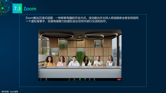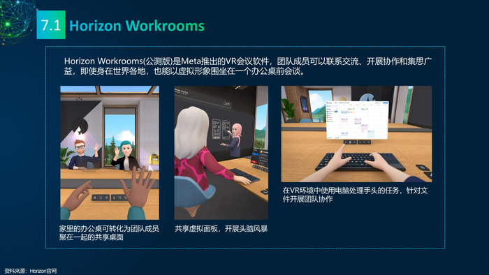 看点7:元宇宙之虚拟办公。虚拟办公是元宇宙的重要业态,网络会议是虚拟办公发展最快的应用场景。Meta、微软、Vizible使用VR/AR技术在虚拟会议场景发力,注重网络会议的在场体验,提升多人协作效率。