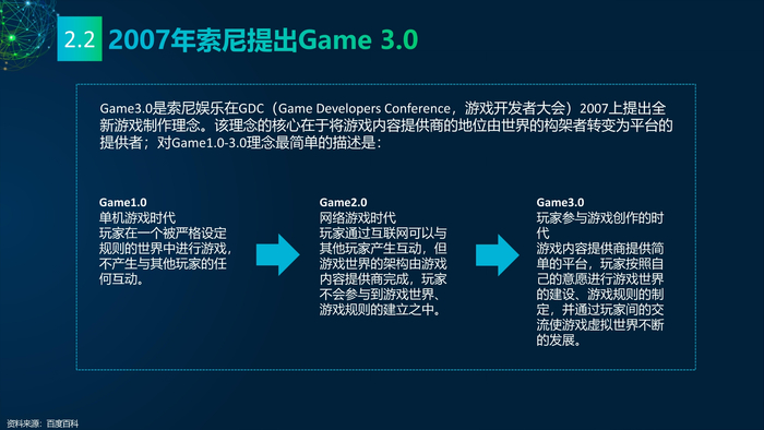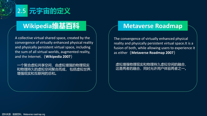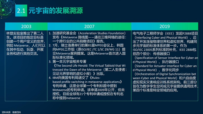 看点2:元宇宙的科学定义。溯源元宇宙概念的发展历程,电气电子工程师学会(IEEE)曾在2007年给出“元宇宙发展地图”,作出短期和长期发展规划。维基百科定义元宇宙是一个聚合的虚拟共享空间,由虚拟增强的物理现实和物理持久的虚拟空间聚合而成,包括虚拟世界、增强现实和互联网的总和。IEEE和Metaverse Roadmap也分别给出元宇宙的定义。