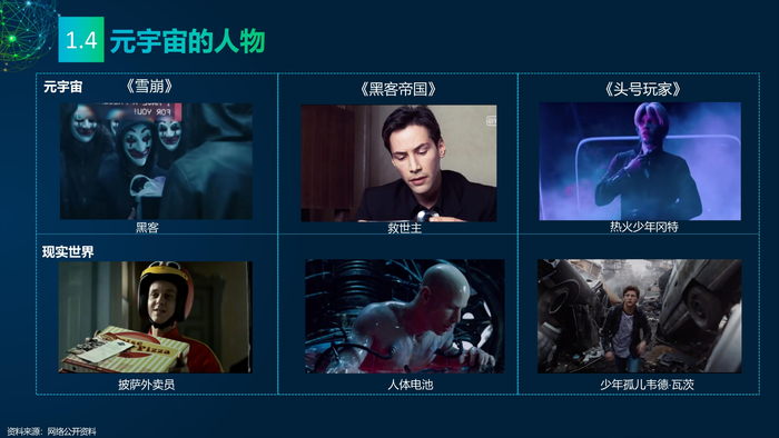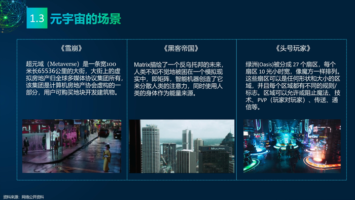 看点1:元宇宙的科幻视角。三部经典的科幻作品《雪崩》《黑客帝国》《头号玩家》中均有对元宇宙的刻画,科幻元宇宙有三个特点:一是元宇宙由虚拟与现实世界构成;二是有从现实世界进入虚拟世界的入口;三是在虚拟和现实世界中有不同的身份。